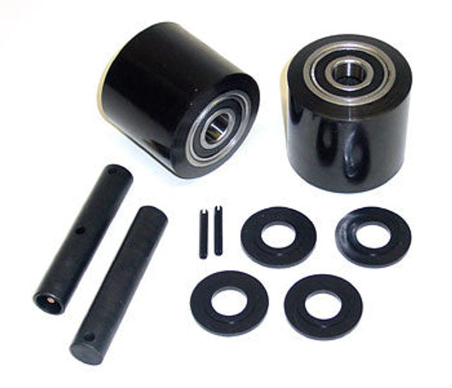 Wesco GWK-WiC2-LW replacement load wheel kit engineered for manual pallet jack model 272748. Features 3 inch diameter x 2.75 inch width Ultra-Poly polyurethane wheels with 70D Shore hardness rating. Pre-assembled units include sealed precision bearings, heat-treated steel axle shafts, and complete mounting hardware. Black polyurethane construction provides durability for material handling applications.